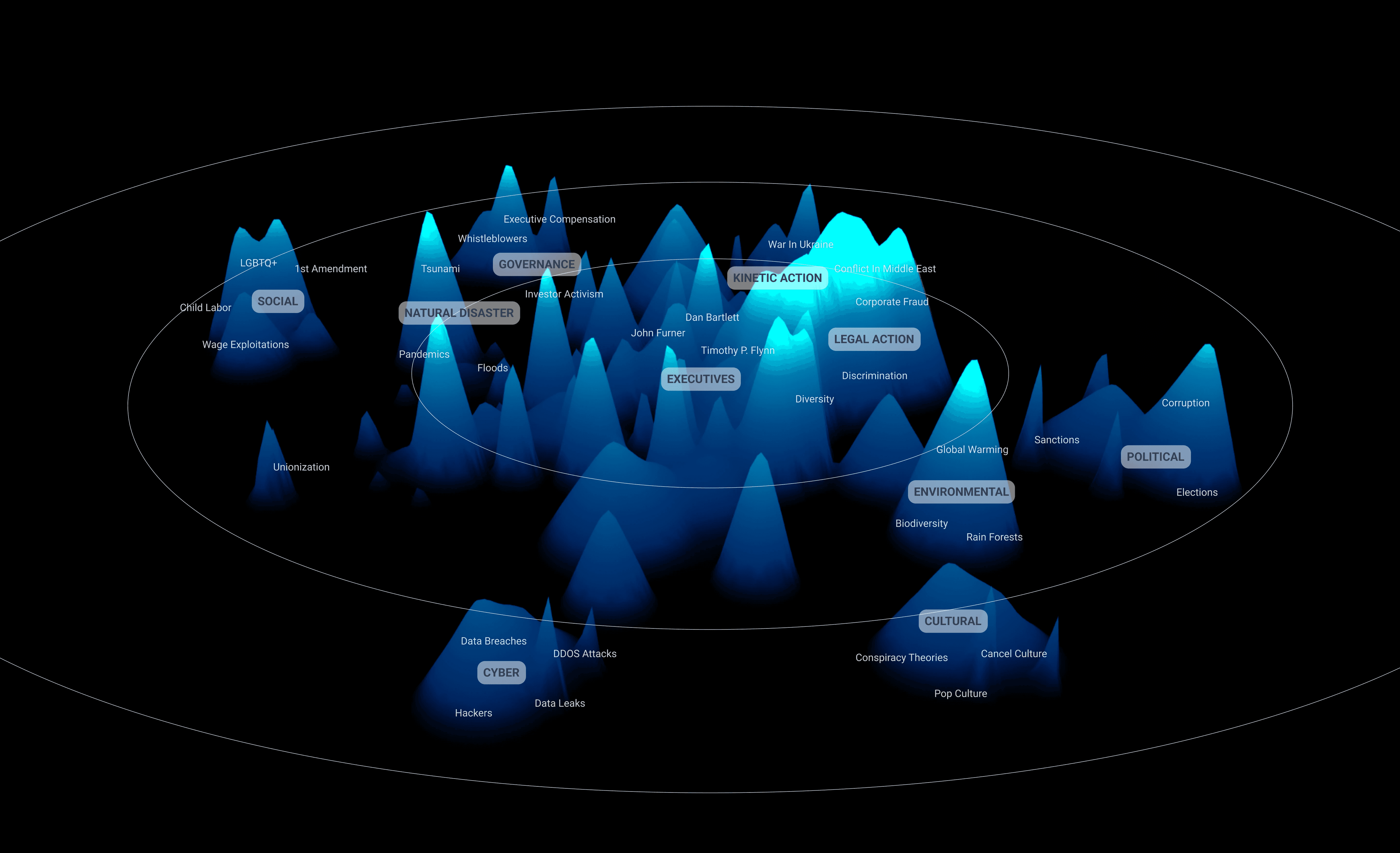 Abstract risk data transformed into interactive 3D maps where threats appear as topographical features based on magnitude, urgency, and interconnectedness. Complexity made tangible.